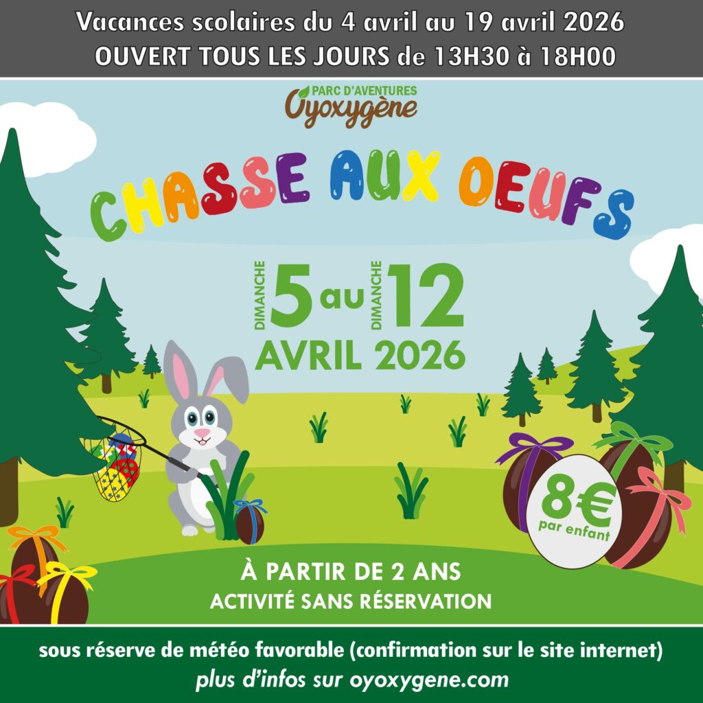 EVENEMENT : du dimanche 5 au dimanche 12 avril 2026, c’est chasse aux œufs au Parc Oyoxygène. Activité sans réservation, accessible en plus des autres activités du parc. Chasse aux œufs à l’occasion de Pâques