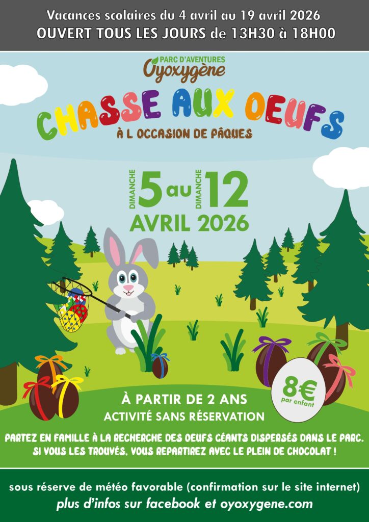 Comme chaque année en avril, Pâco, le plus jeune lapin du Parc Oyoxygène a besoin de votre aide pour retrouver les œufs géants qui ont été cachés dans le parc avant qu’ils ne disparaissent.